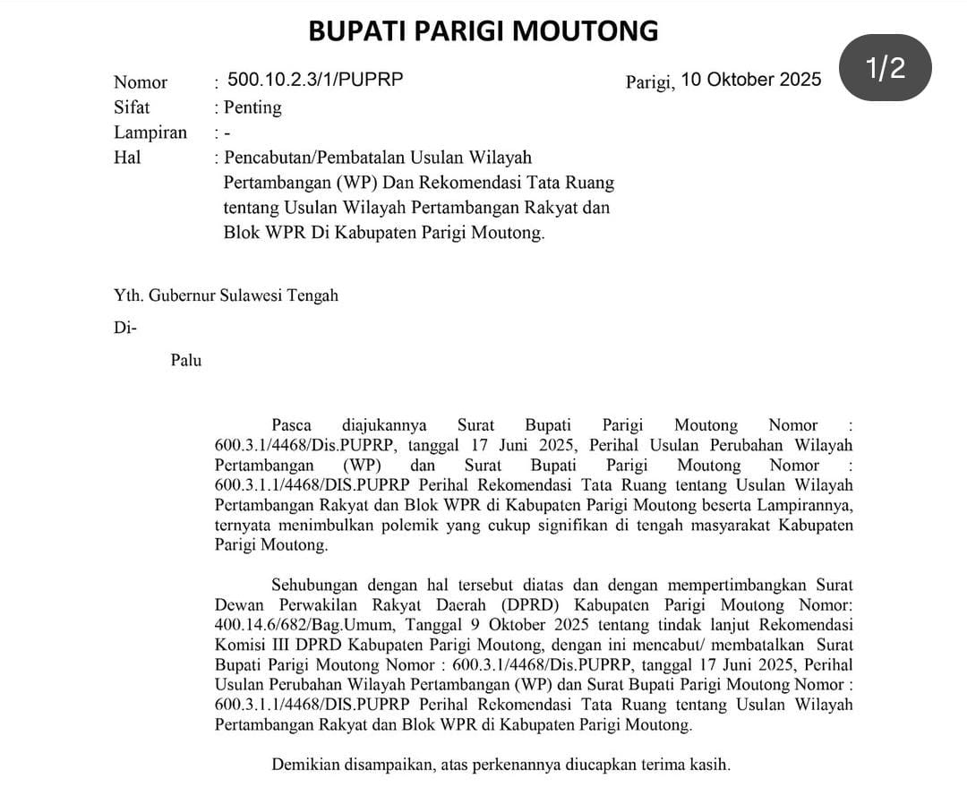 Keputusan ini tertuang dalam Surat Bupati Parigi Moutong Nomor 500.10.2.3/1/PUPRP tanggal 10 Oktober 2025 yang ditujukan kepada Gubernur Sulawesi Tengah di Palu. Langkah tersebut menjadi respon tegas pemerintah daerah atas dinamika dan polemik yang berkembang di masyarakat pasca pengajuan usulan WP beberapa waktu lalu.